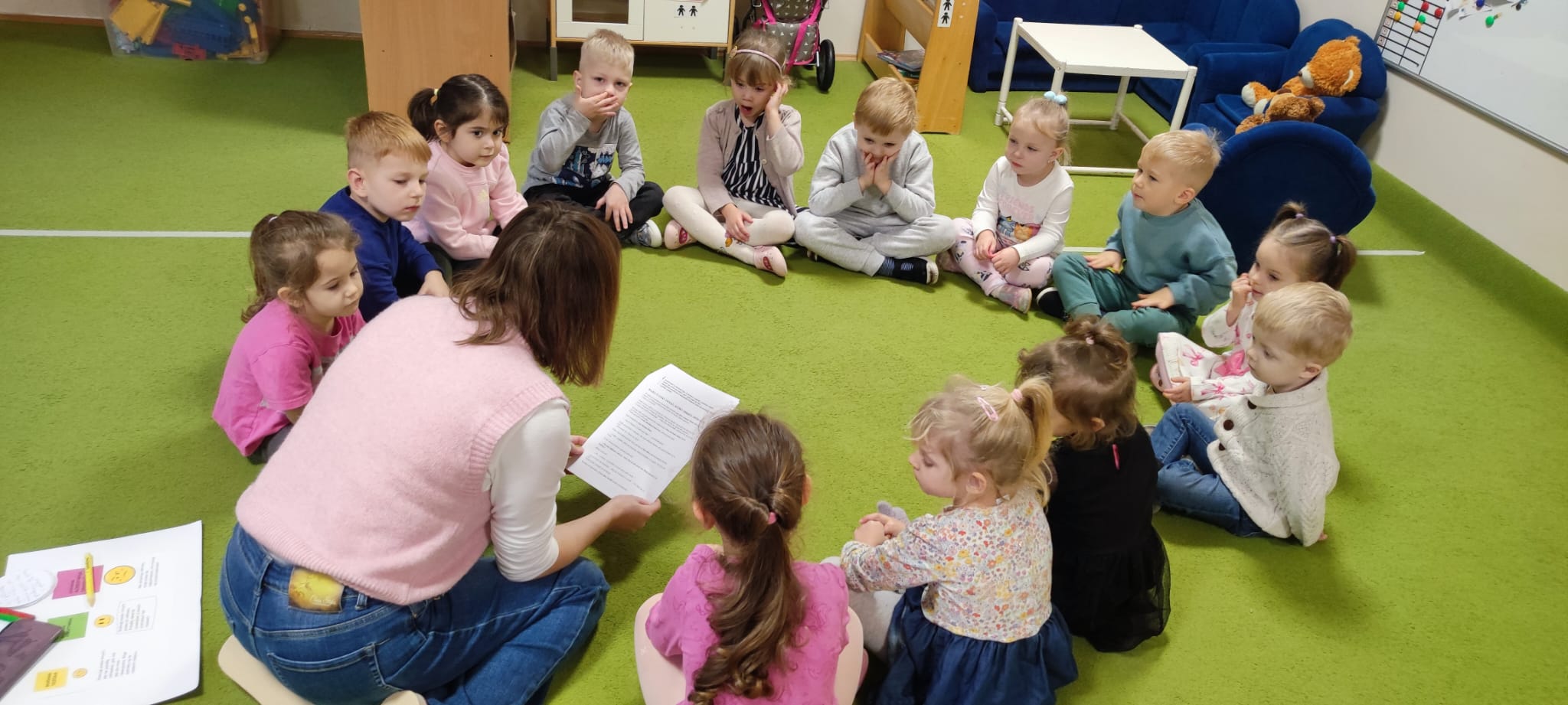 Na zakończenie działań odbyło się spotkanie z psychologiem przedszkolnym, panią Ireną, która w przystępny i ciepły sposób rozmawiała z dziećmi o emocjach, szacunku i tolerancji wobec innych. Dzieci z zainteresowaniem dzieliły się swoimi spostrzeżeniami i doświadczeniami.