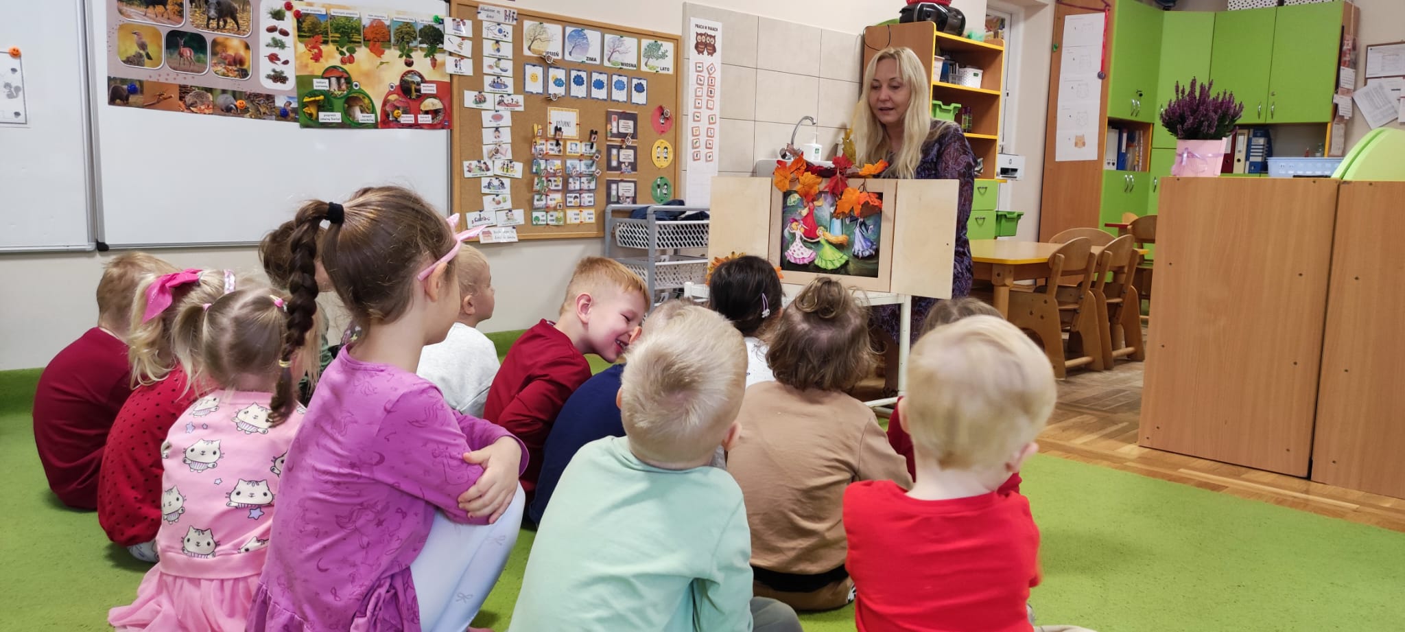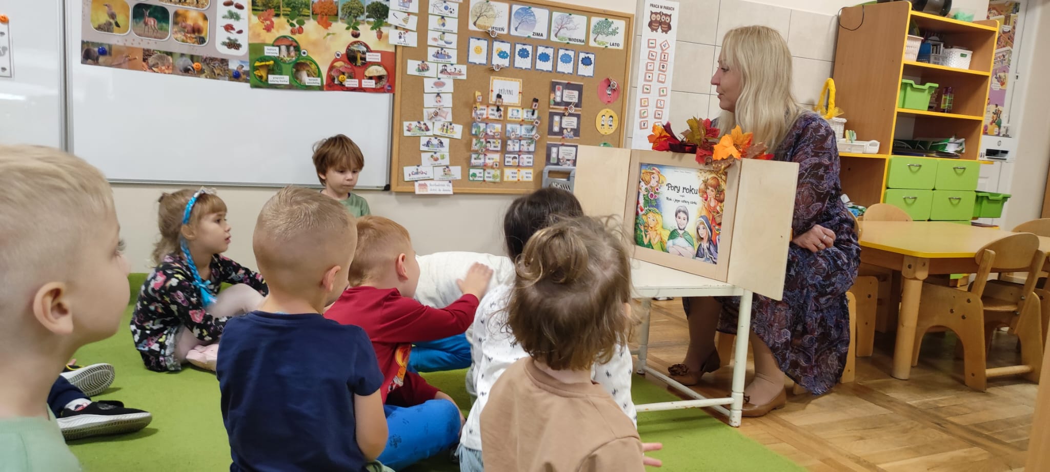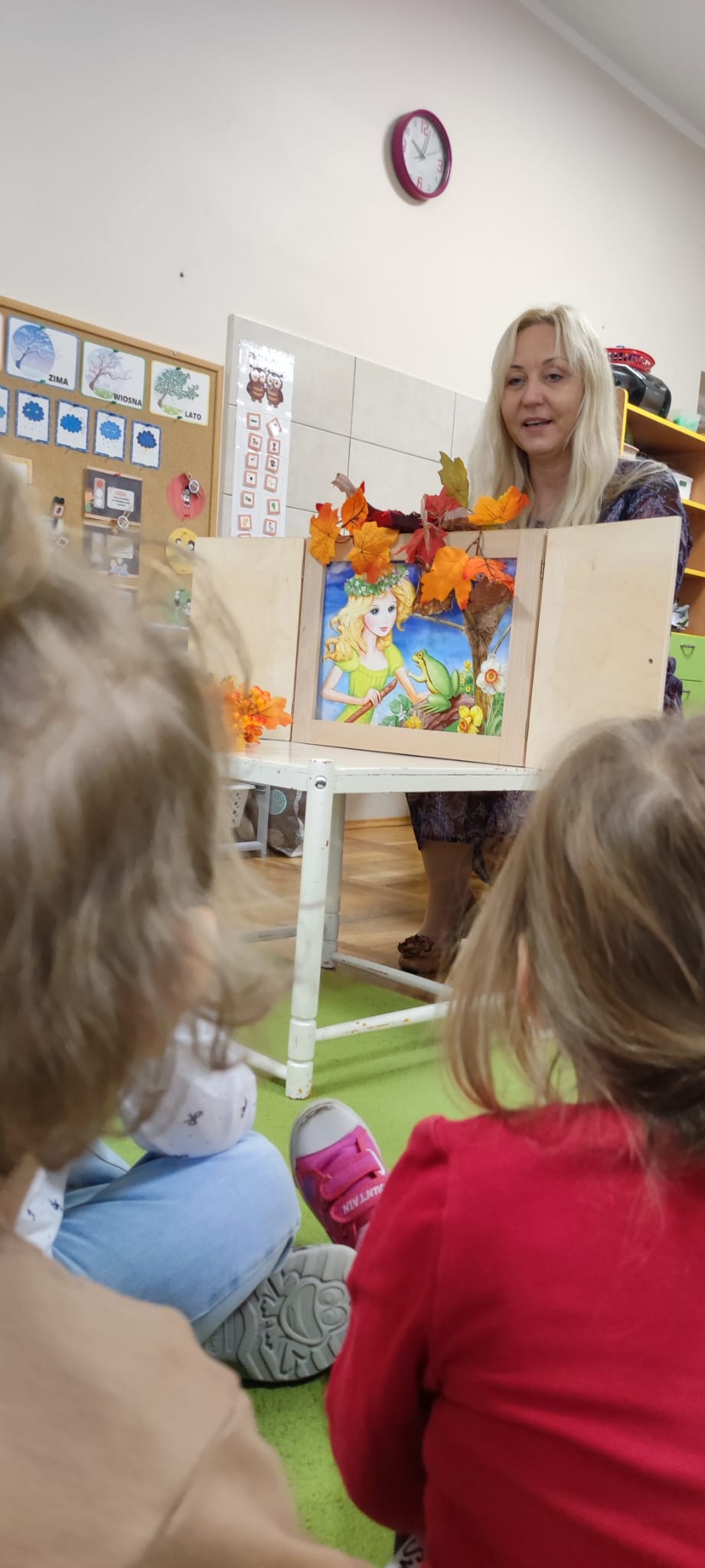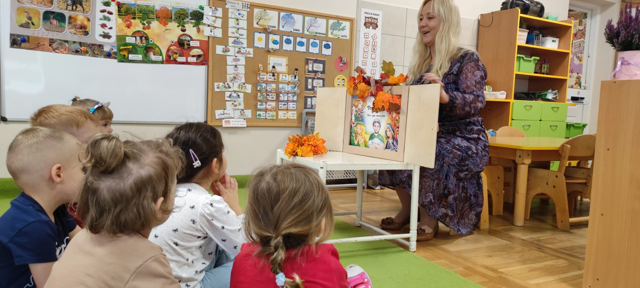 Dzisiaj gościliśmy Panią Wiolettę z Biblioteki Pedagogicznej, która w ramach zbliżającego się Ogólnopolskiego Dnia Głośnego Czytania zaprezentowała dzieciom teatrzyk kamishibai z opowieścią „Rok i jego cztery córki”. Barwna historia o zmieniających się porach roku zachwyciła przedszkolaki i przeniosła je w magiczny świat teatru obrazkowego.