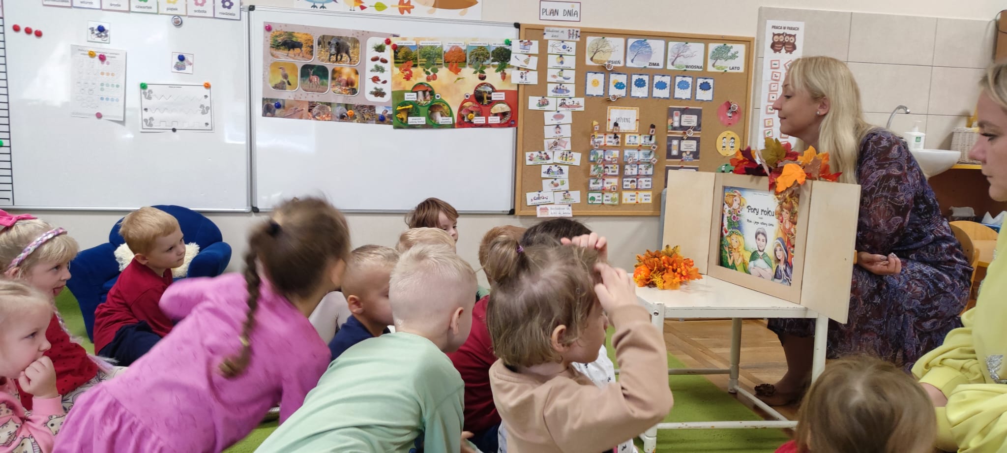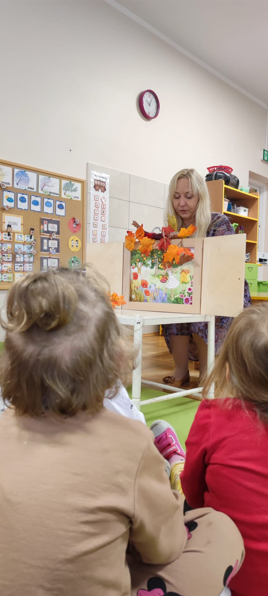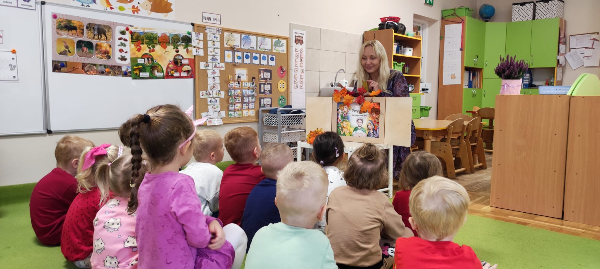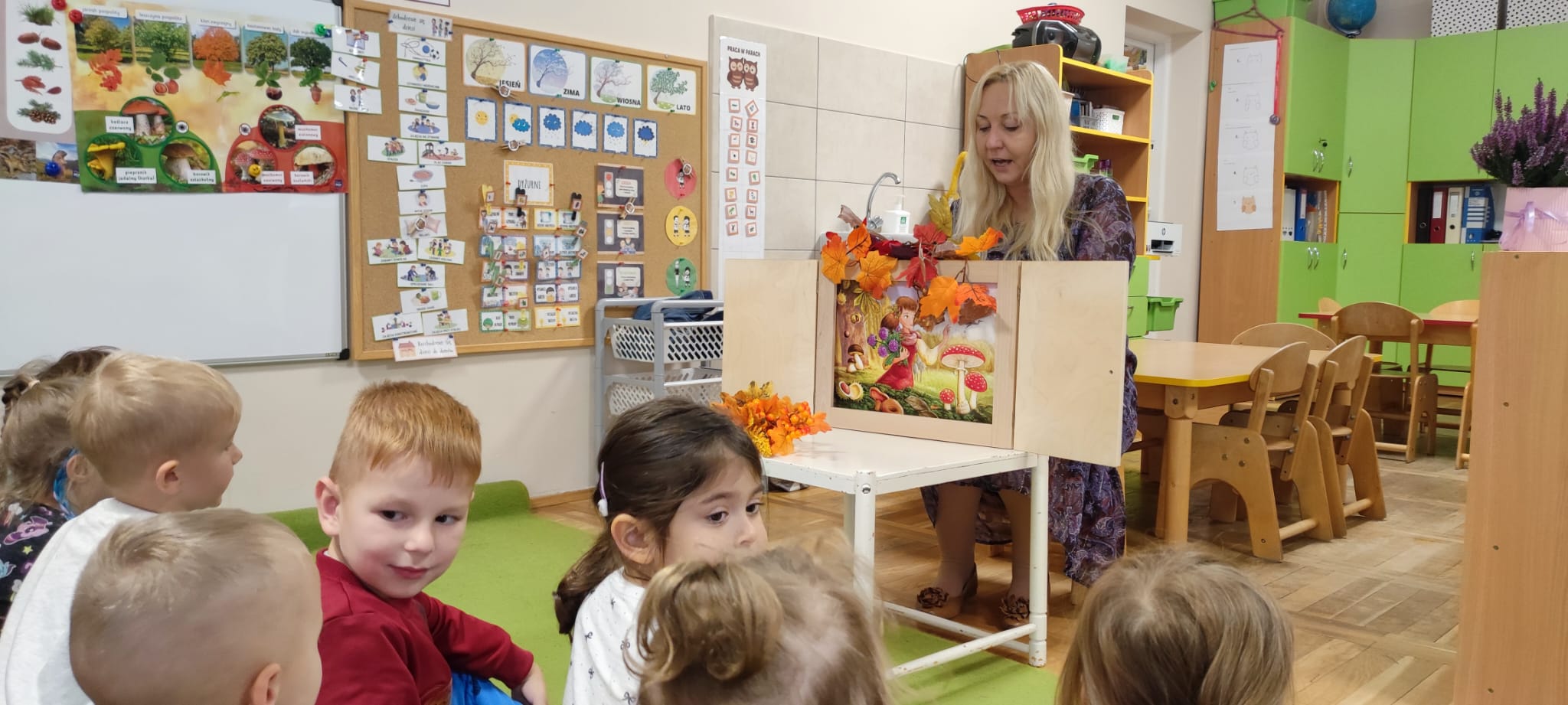 Dzisiaj gościliśmy Panią Wiolettę z Biblioteki Pedagogicznej, która w ramach zbliżającego się Ogólnopolskiego Dnia Głośnego Czytania zaprezentowała dzieciom teatrzyk kamishibai z opowieścią „Rok i jego cztery córki”. Barwna historia o zmieniających się porach roku zachwyciła przedszkolaki i przeniosła je w magiczny świat teatru obrazkowego.
