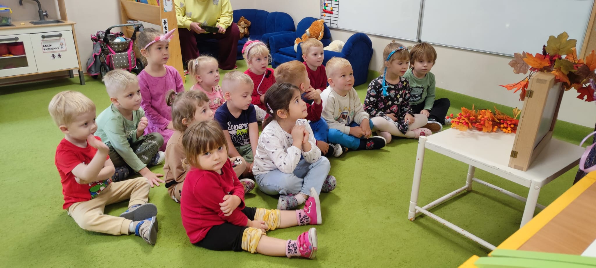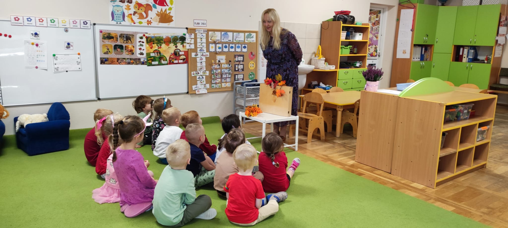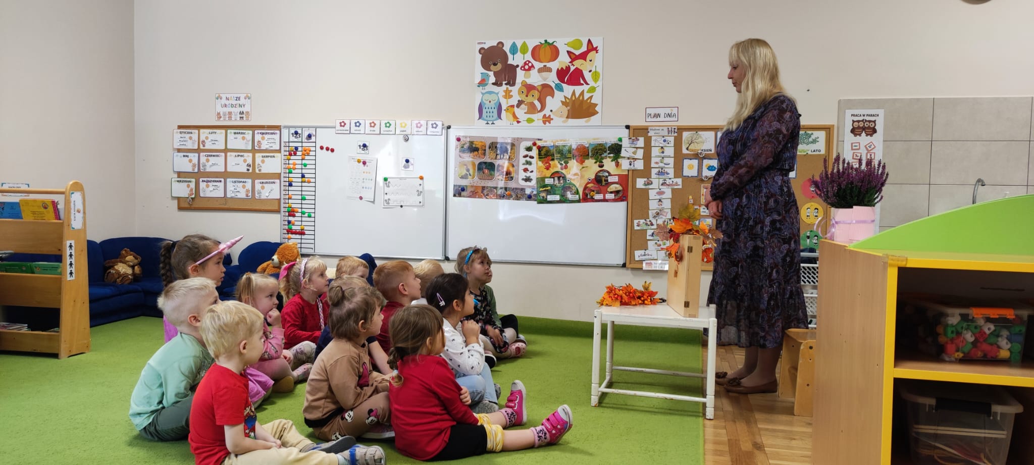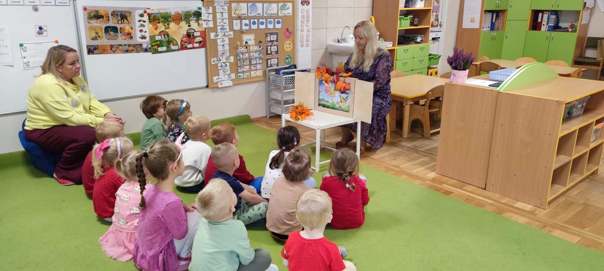 Dzisiaj gościliśmy Panią Wiolettę z Biblioteki Pedagogicznej, która w ramach zbliżającego się Ogólnopolskiego Dnia Głośnego Czytania zaprezentowała dzieciom teatrzyk kamishibai z opowieścią „Rok i jego cztery córki”. Barwna historia o zmieniających się porach roku zachwyciła przedszkolaki i przeniosła je w magiczny świat teatru obrazkowego.