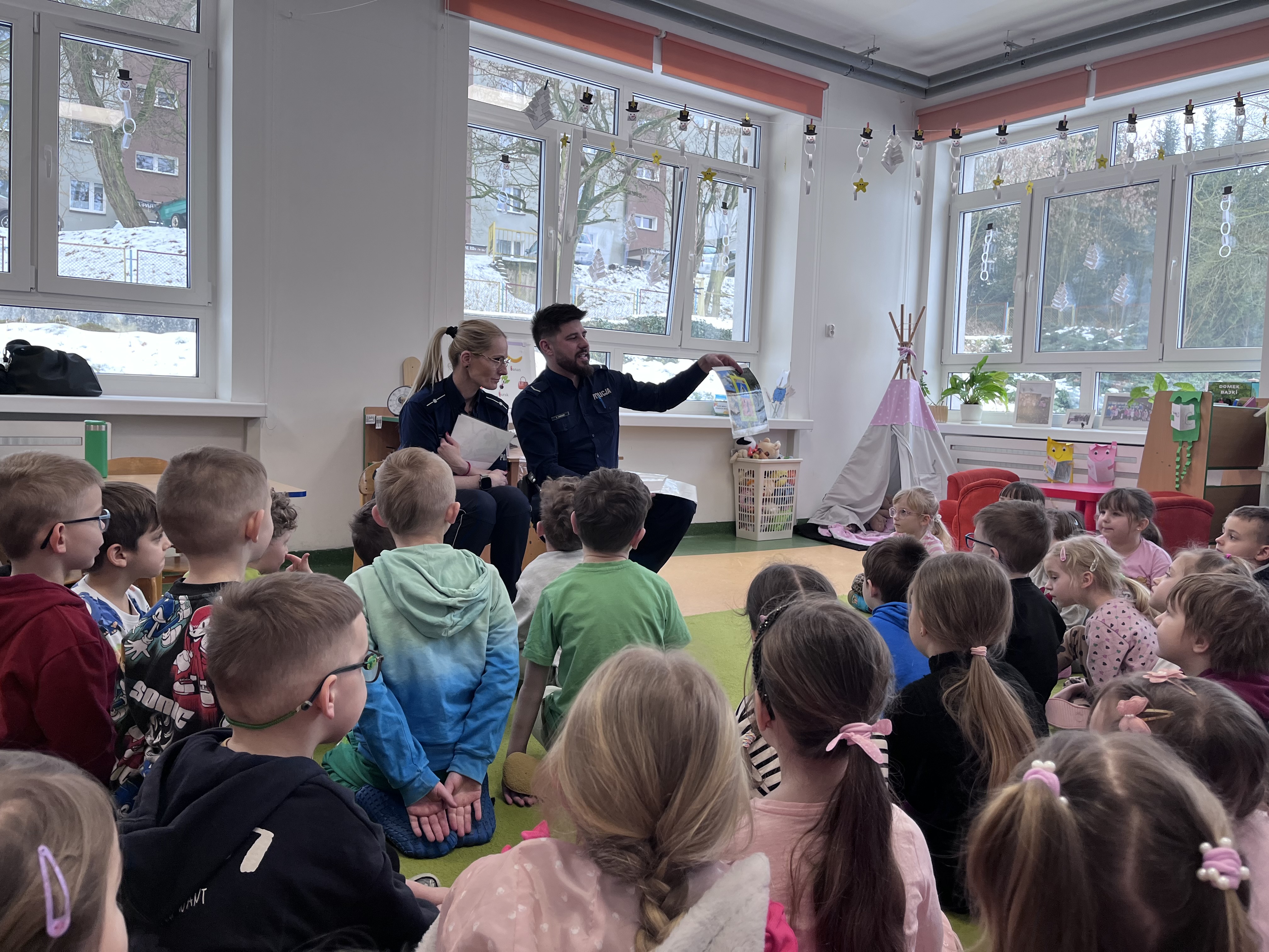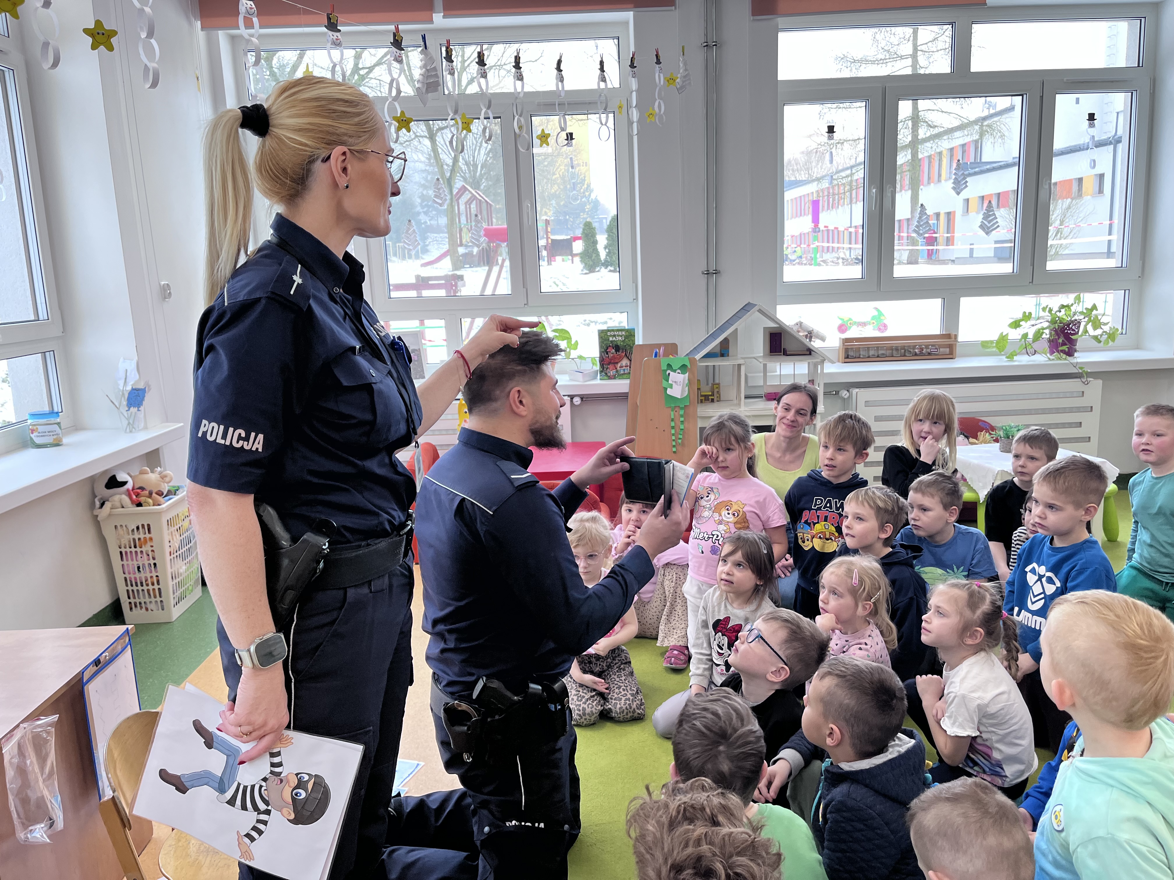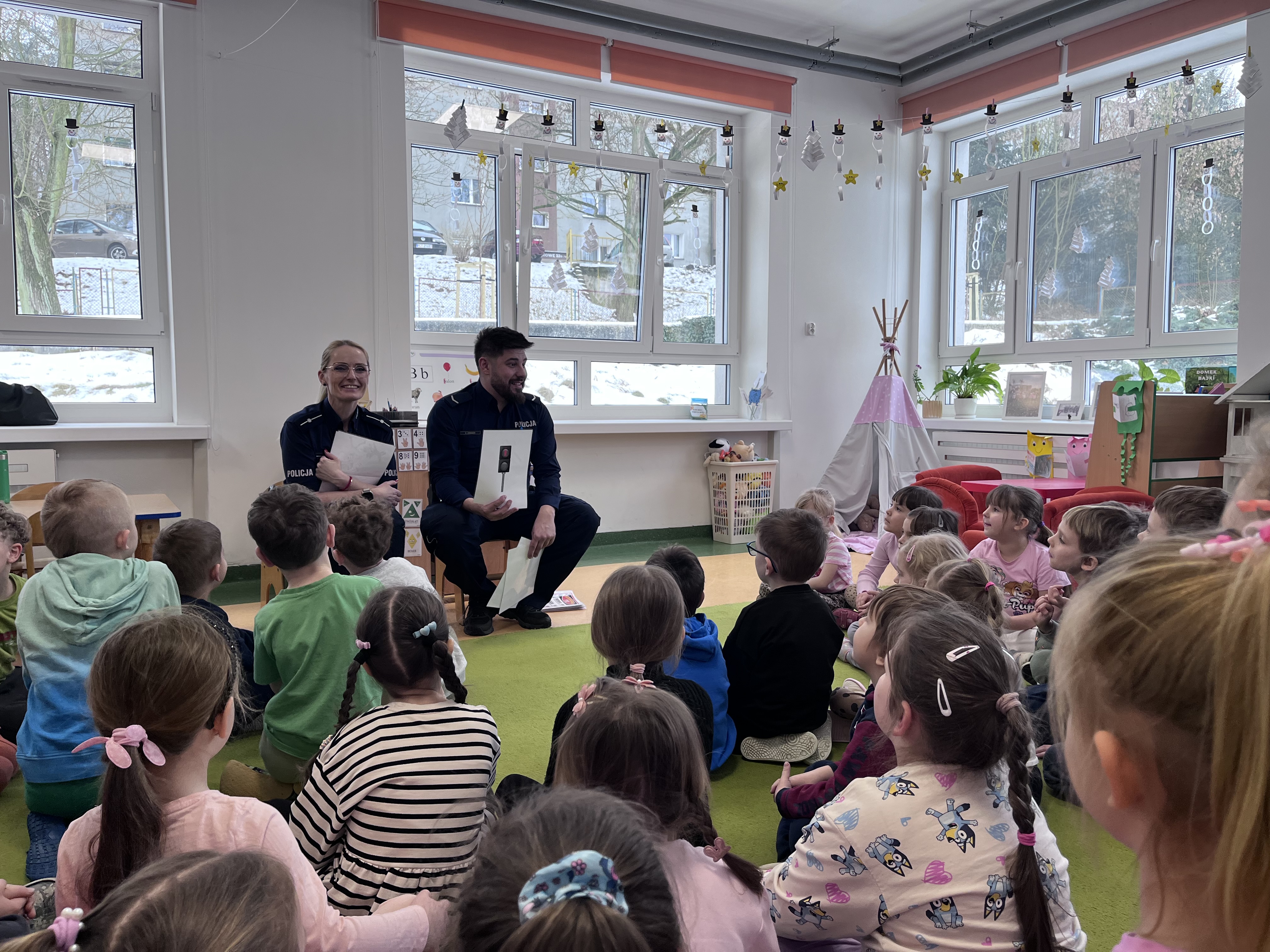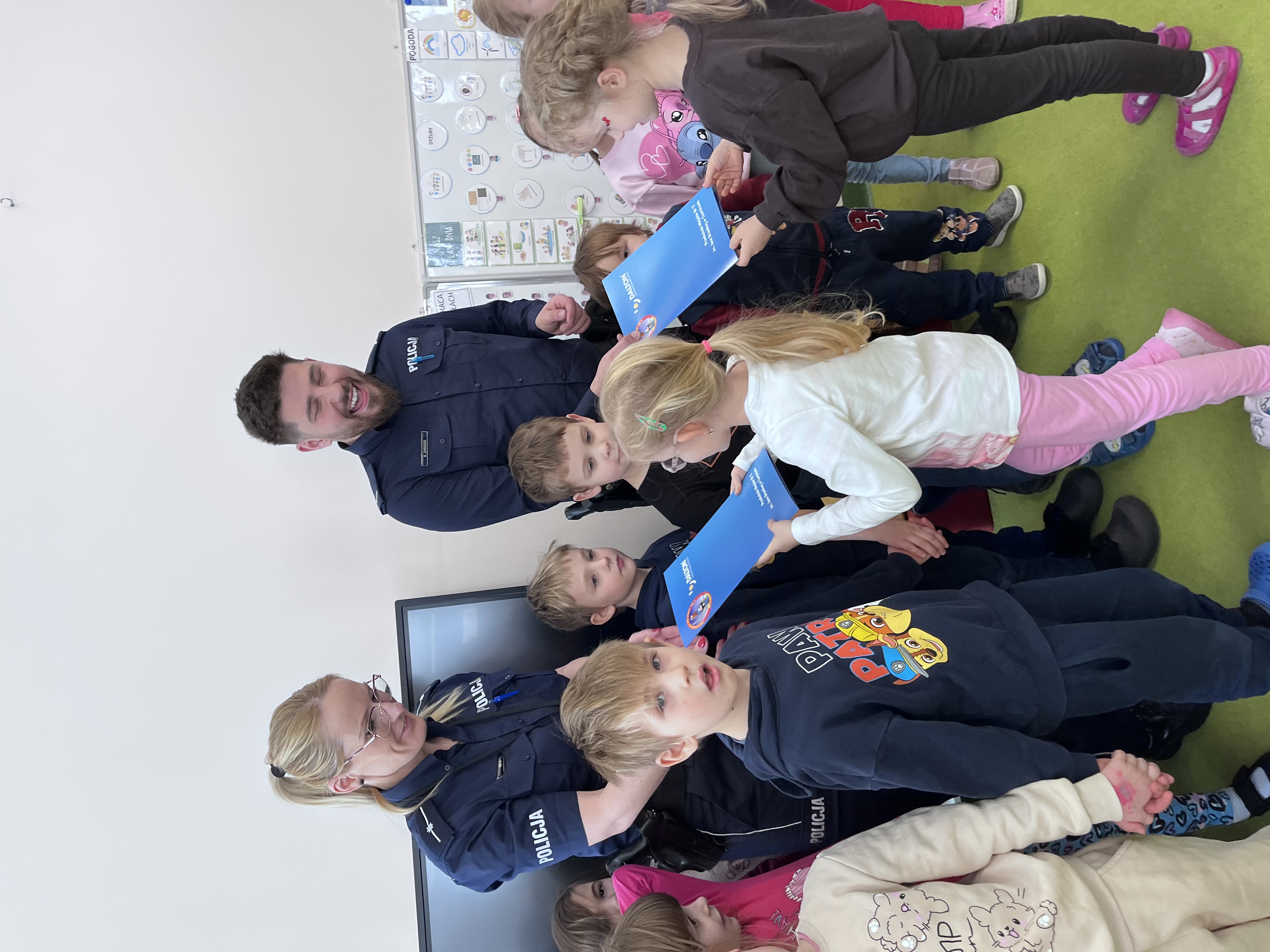 Celem wizyty było utrwalenie zasad bezpieczeństwa podczas ferii zimowych oraz w codziennych sytuacjach życiowych. Przypomnienie dzieciom o zasadach bezpiecznego poruszania się po drogach, właściwym zachowaniu w kontaktach z osobami nieznajomymi. Omówiono również zasady bezpiecznych zabaw zimowych, w tym unikania wchodzenia na zamarznięte akweny oraz konieczność korzystania z elementów odblaskowych.