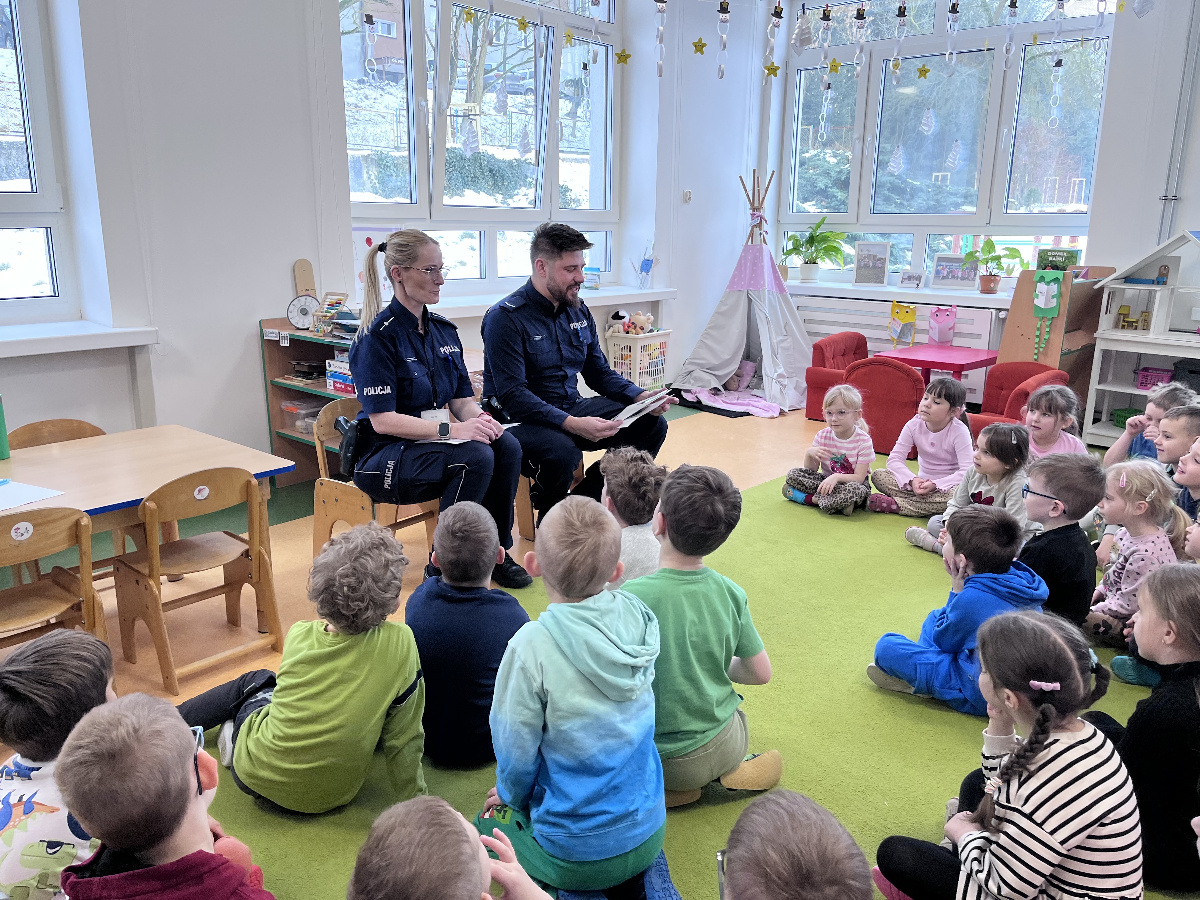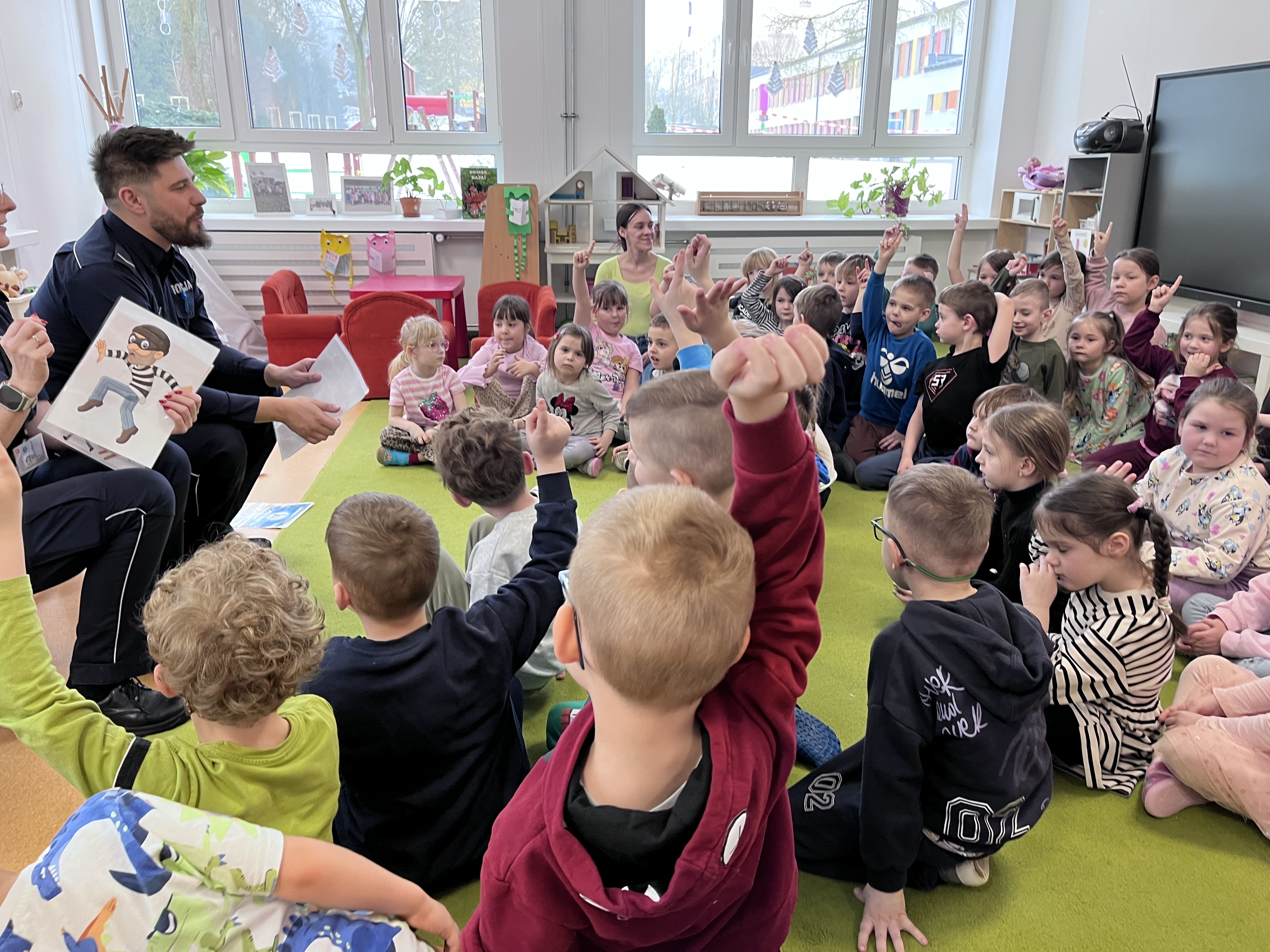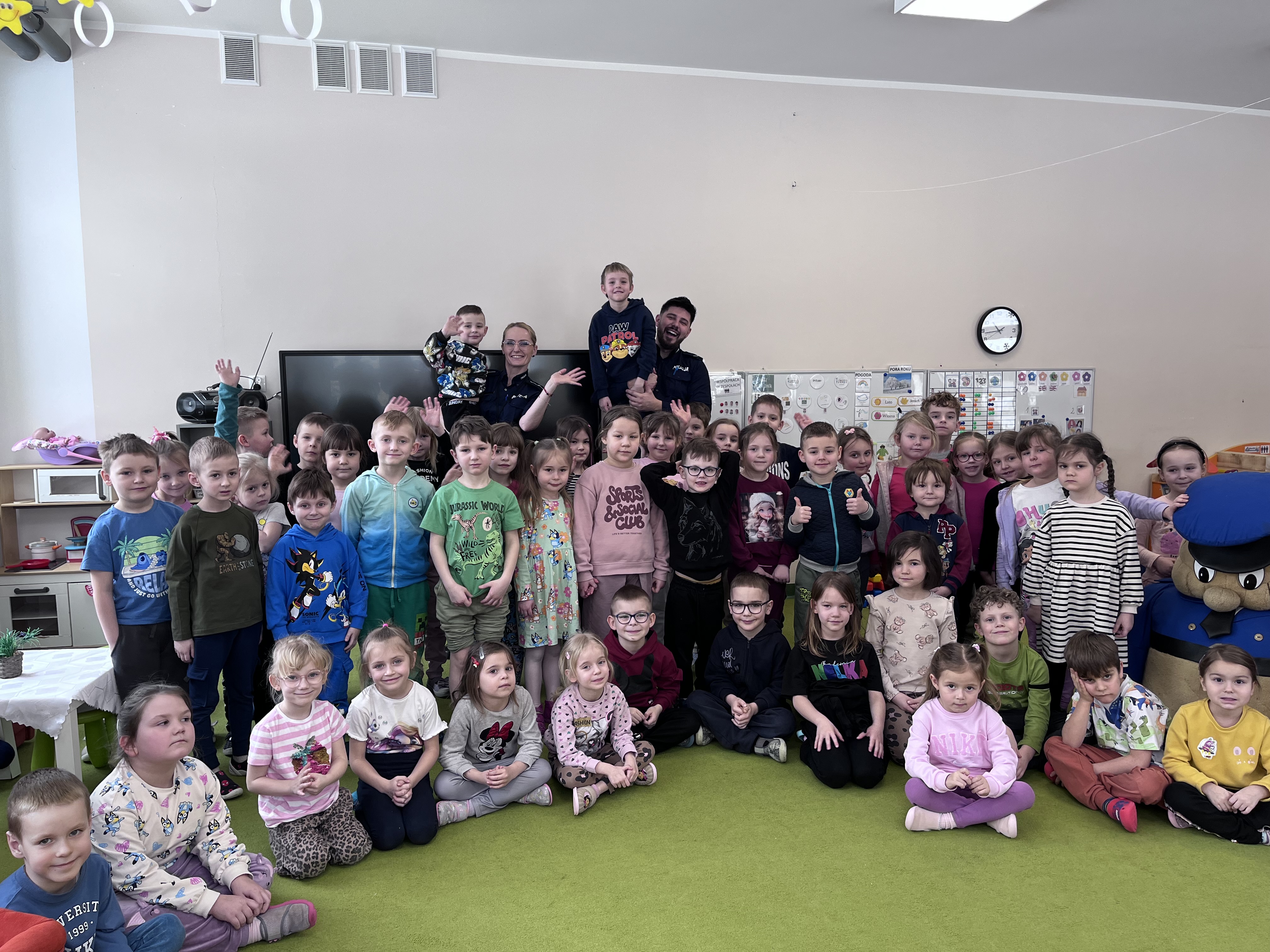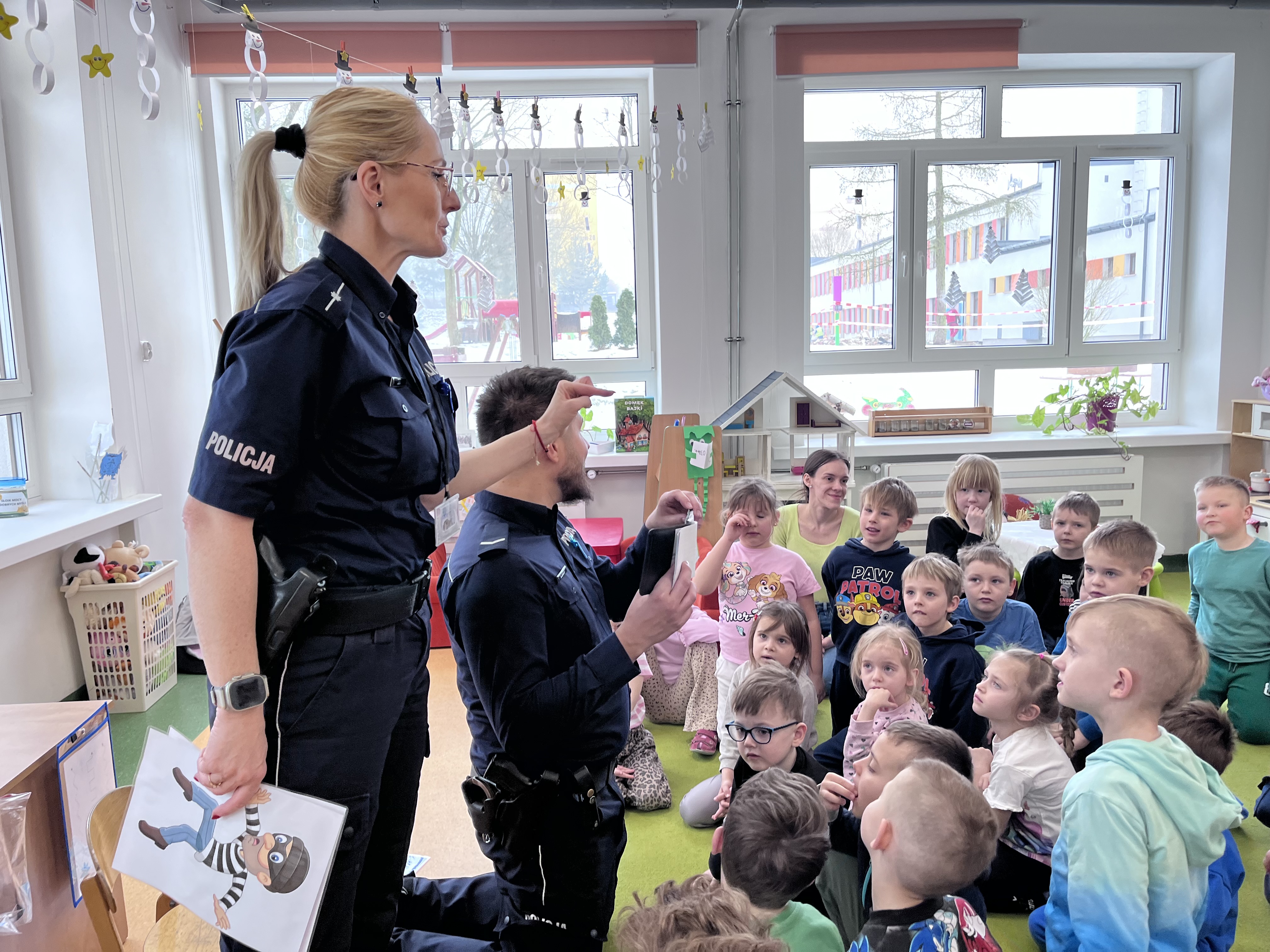 Celem wizyty było utrwalenie zasad bezpieczeństwa podczas ferii zimowych oraz w codziennych sytuacjach życiowych. Przypomnienie dzieciom o zasadach bezpiecznego poruszania się po drogach, właściwym zachowaniu w kontaktach z osobami nieznajomymi. Omówiono również zasady bezpiecznych zabaw zimowych, w tym unikania wchodzenia na zamarznięte akweny oraz konieczność korzystania z elementów odblaskowych.