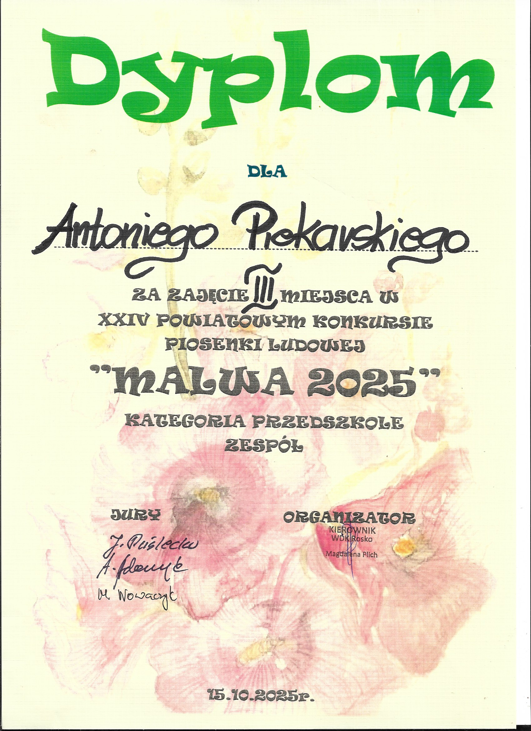 Laura i Antek z grupy "Kokoszki-Smakoszki" wzięli udział w XXIV Powiatowym Konkursie Piosenki Ludowej MALWA, w którym zaprezentowali się w utworze „Lipka”. Ich występ zachwycił wszystkich – odwaga, talent i uśmiech sprawiły, że publiczność poczuła prawdziwą radość z muzyki.