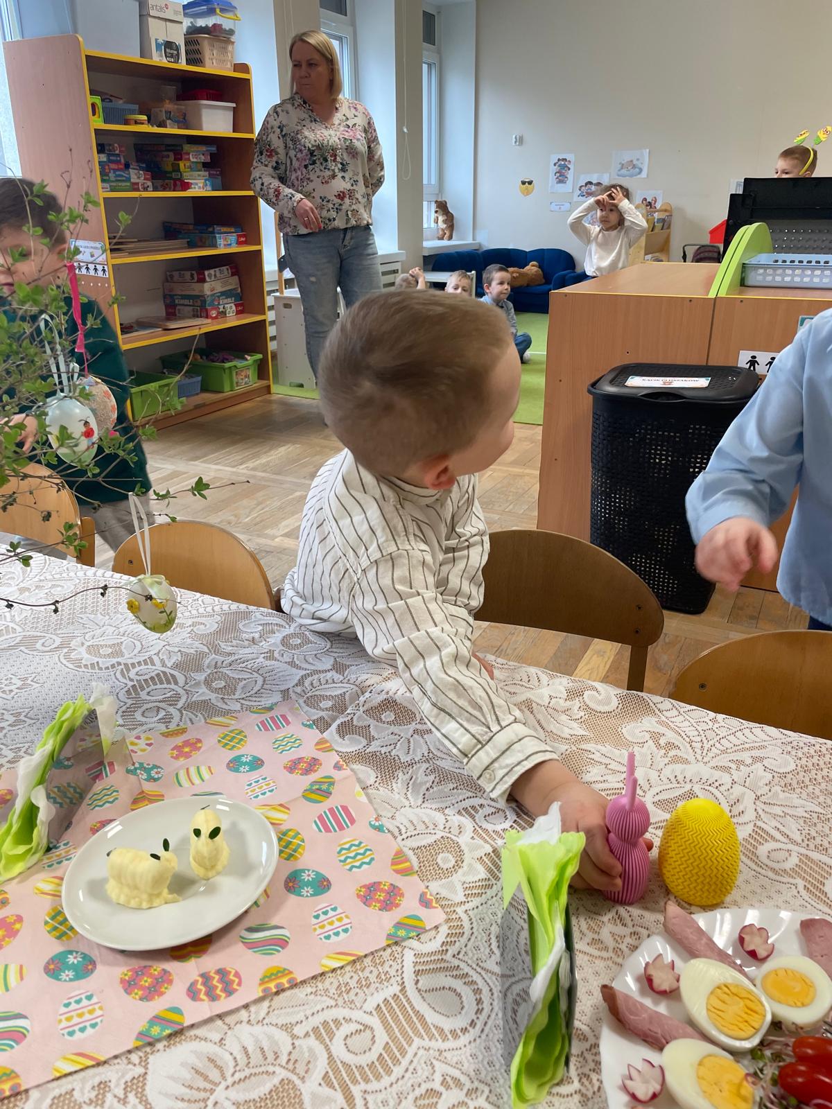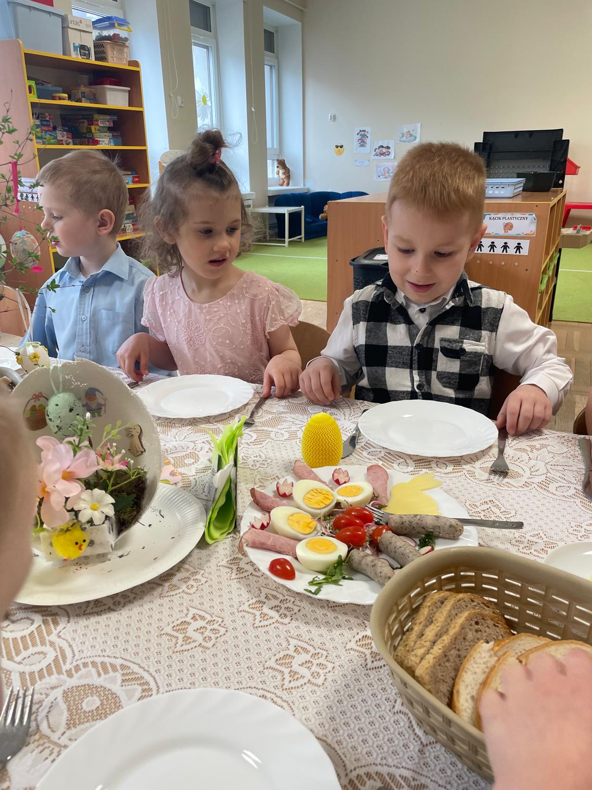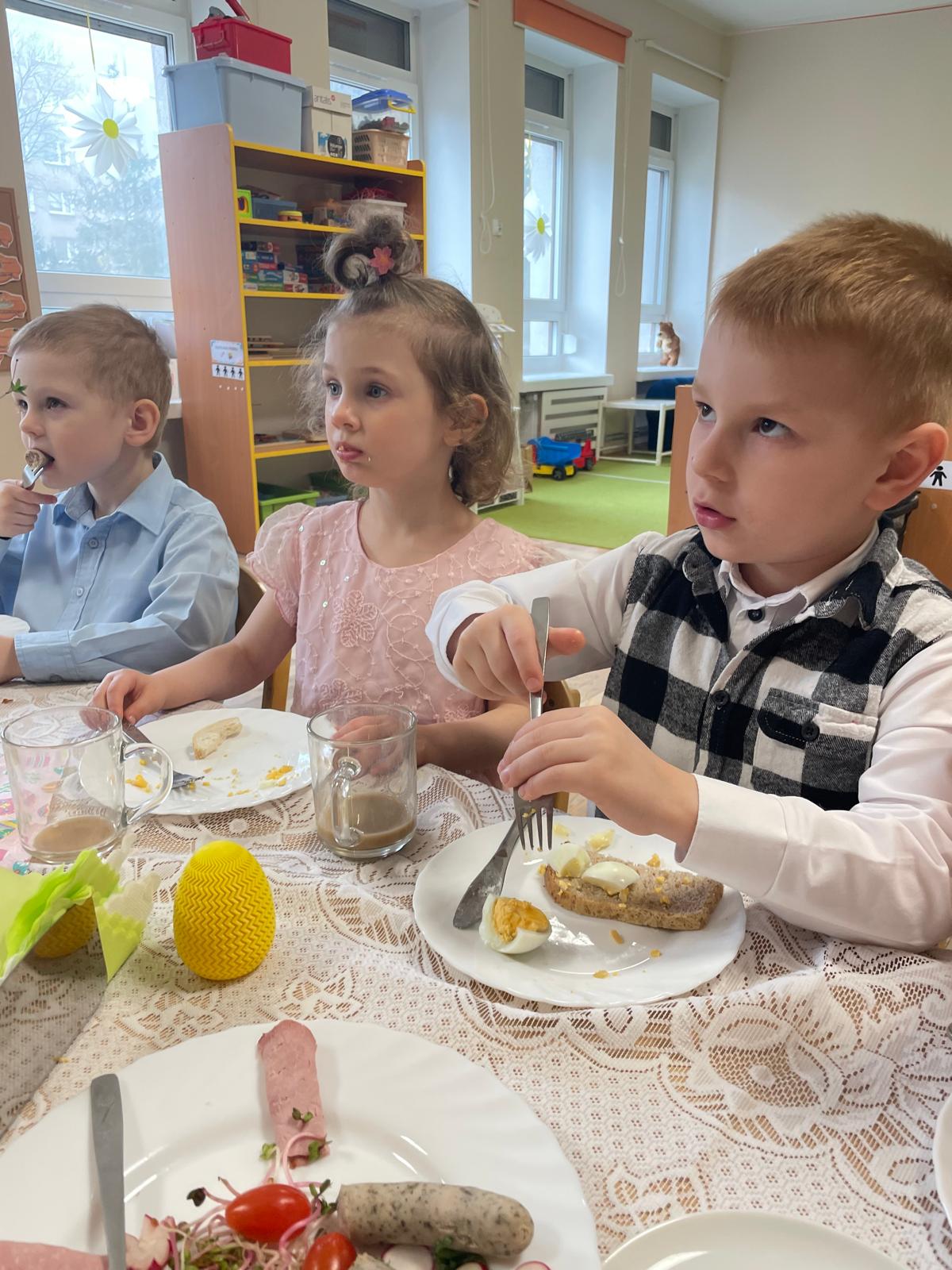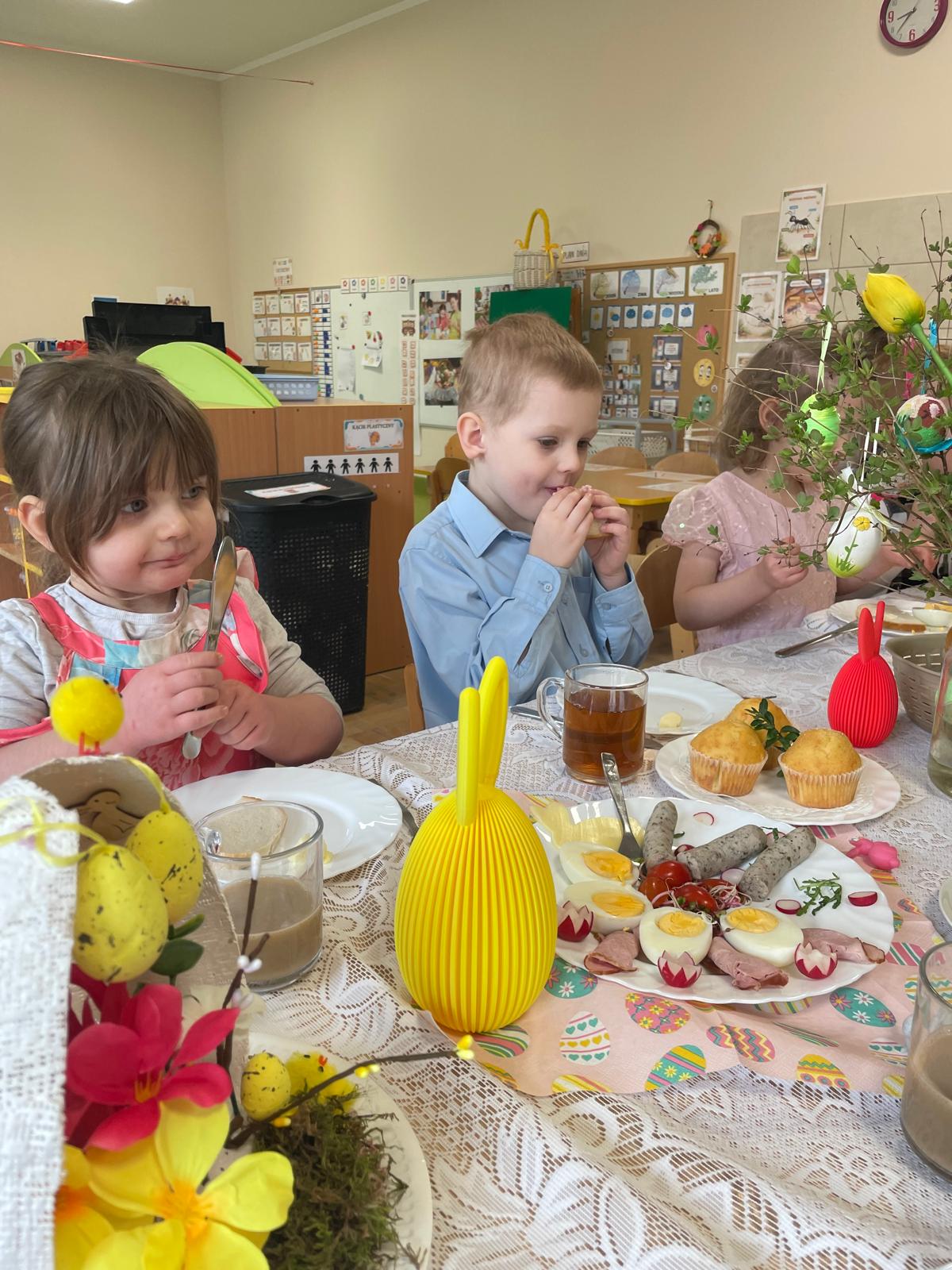 Dzieci wspólnie przygotowały wielkanocny stół, ucząc się nakrywania, porządku i zasad zachowania podczas posiłku. Następnie z apetytem spróbowały świątecznych potraw i dzieliły się swoimi wrażeniami.