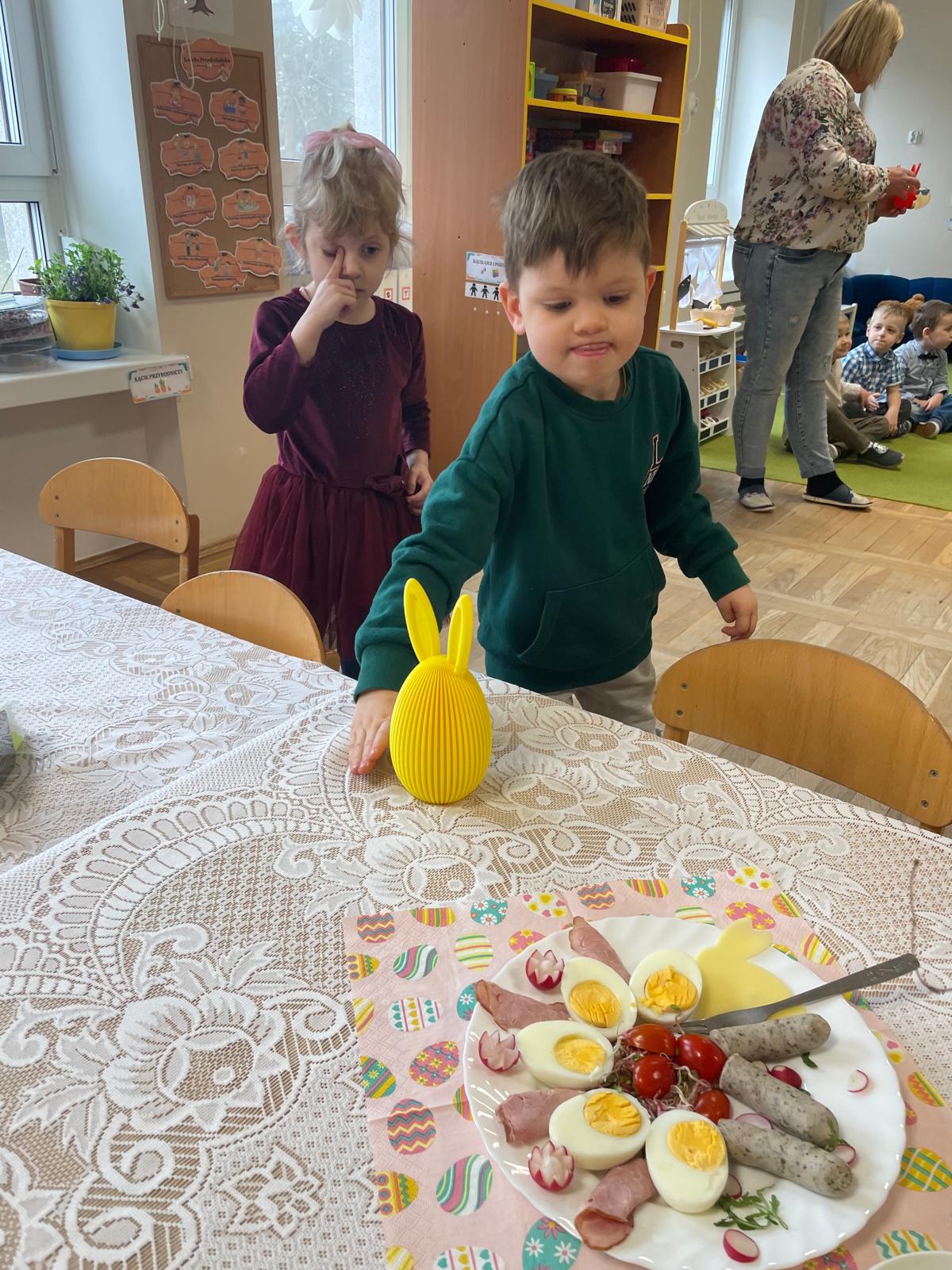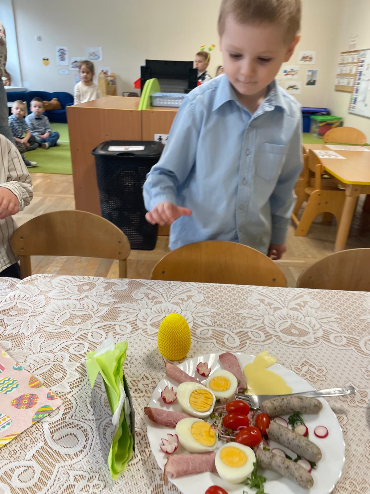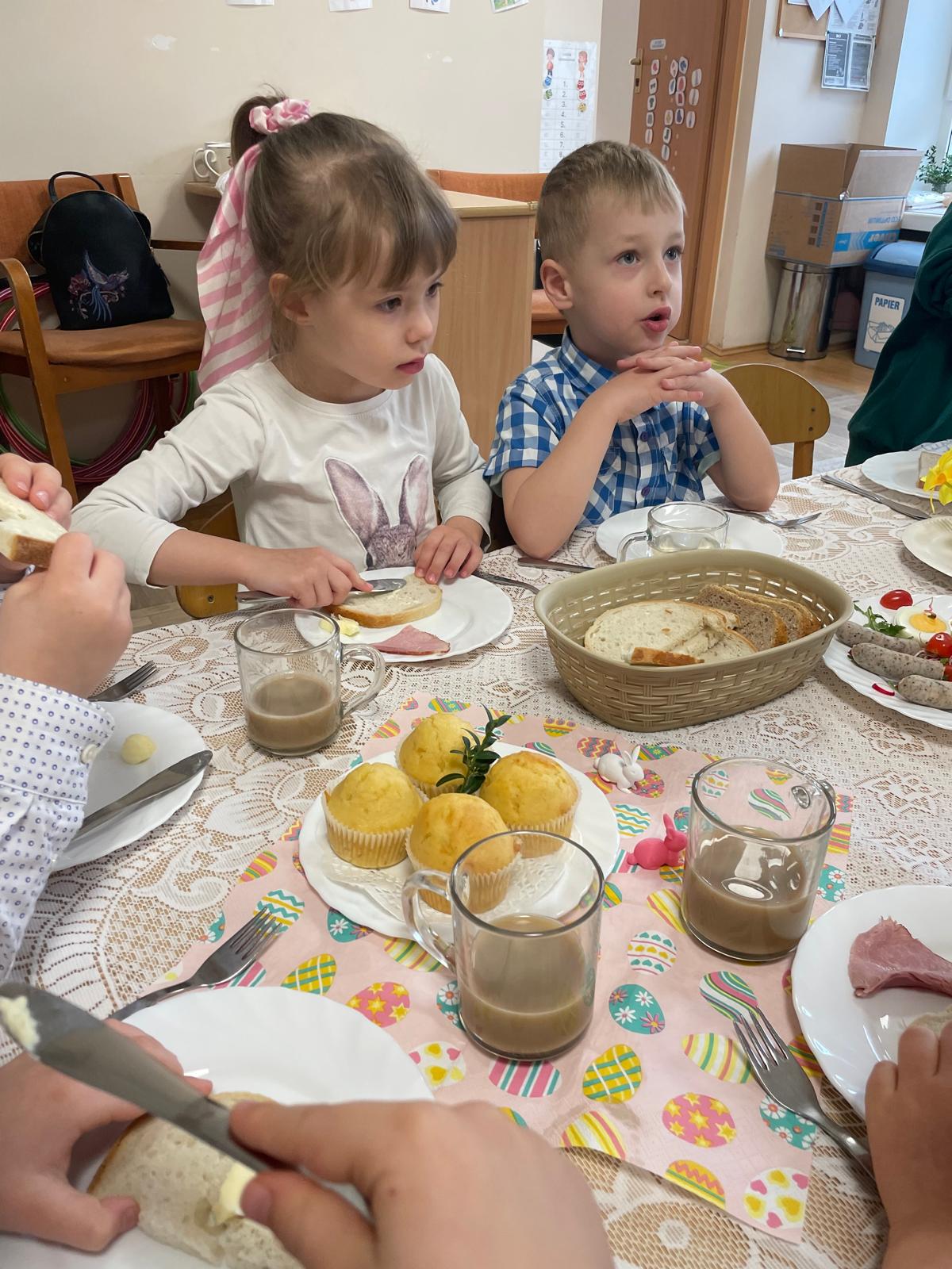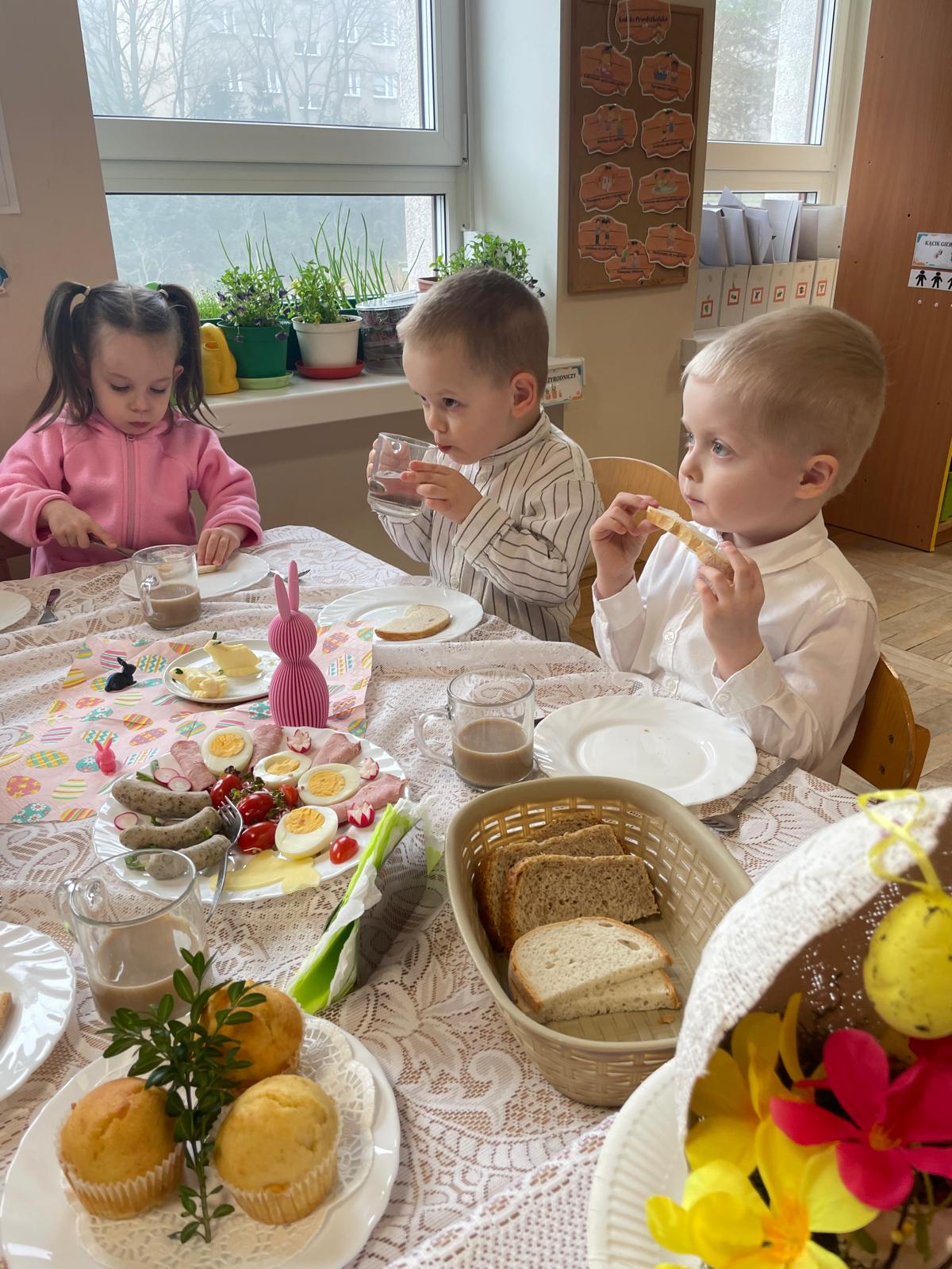 Dzieci wspólnie przygotowały wielkanocny stół, ucząc się nakrywania, porządku i zasad zachowania podczas posiłku. Następnie z apetytem spróbowały świątecznych potraw i dzieliły się swoimi wrażeniami.