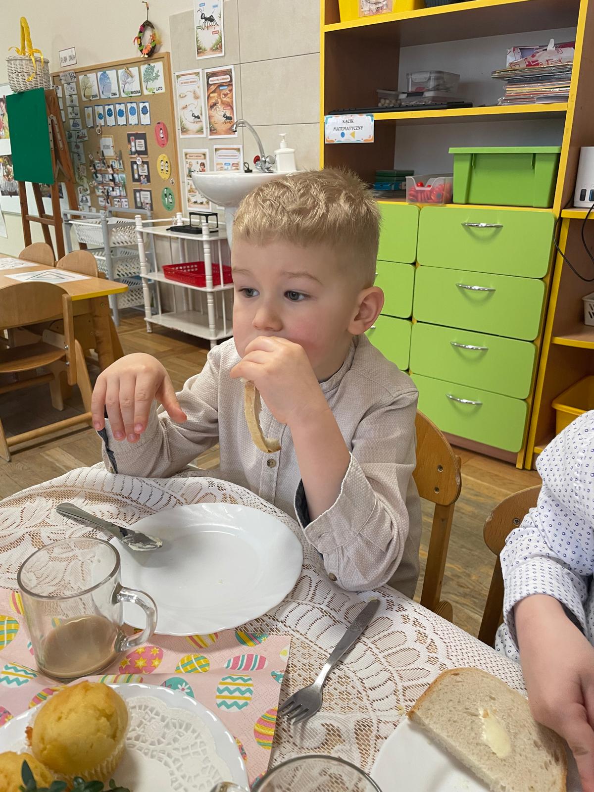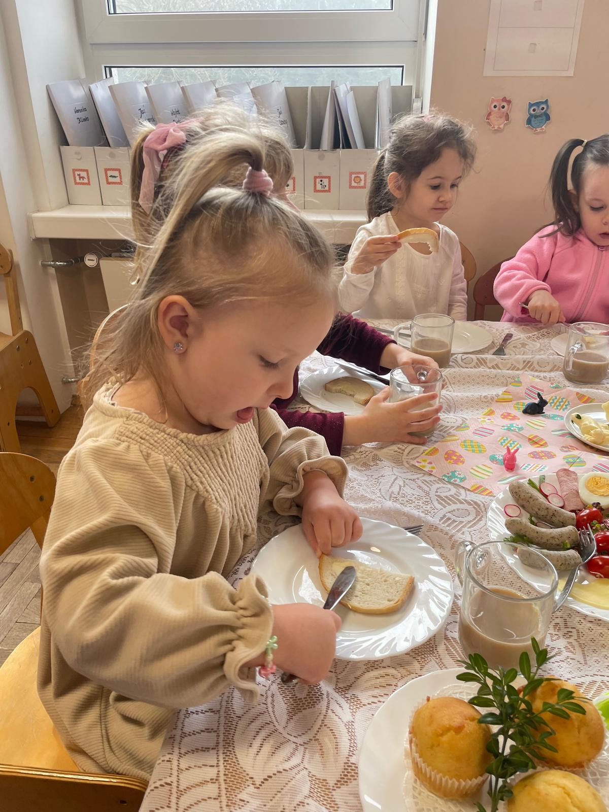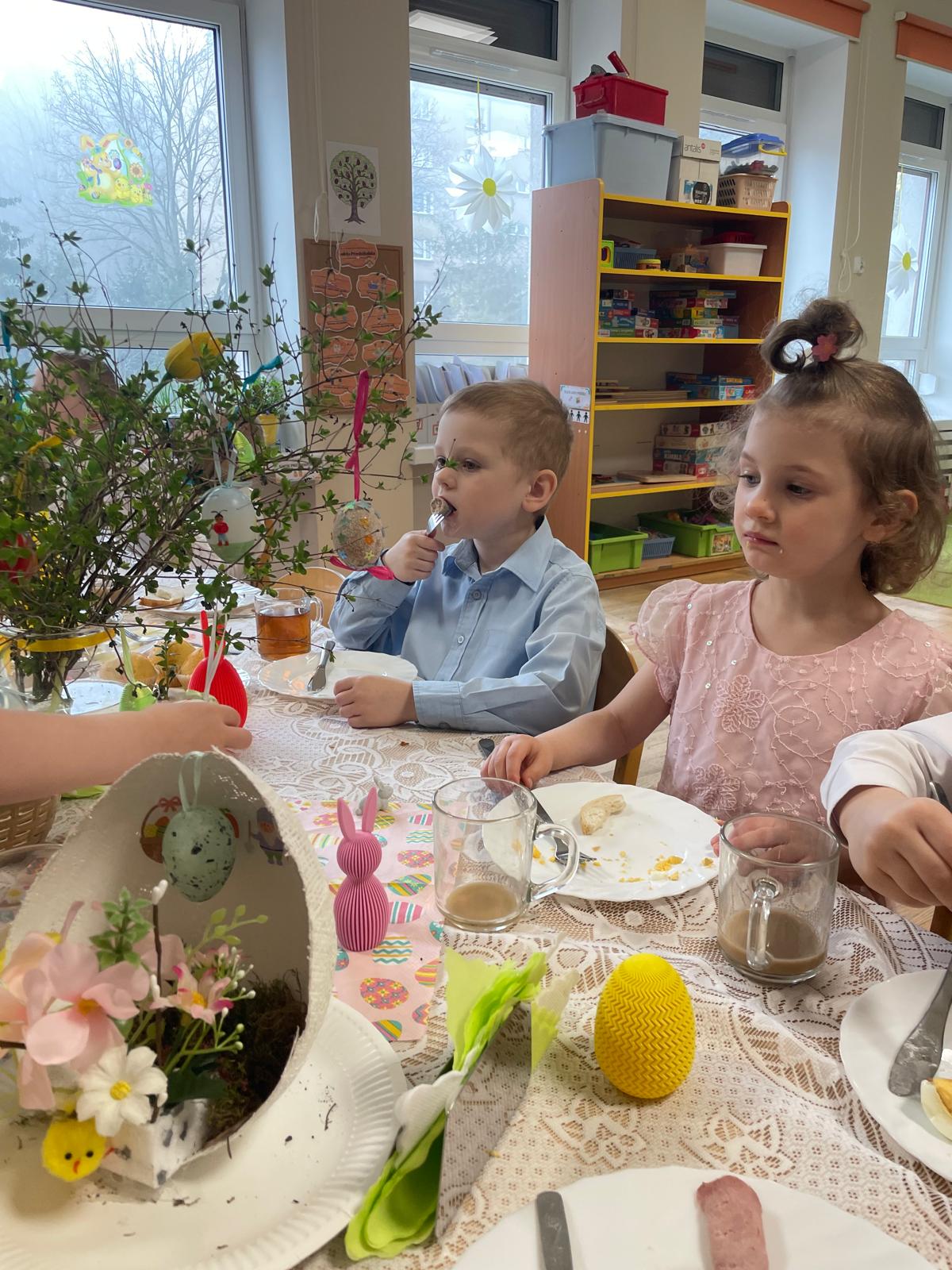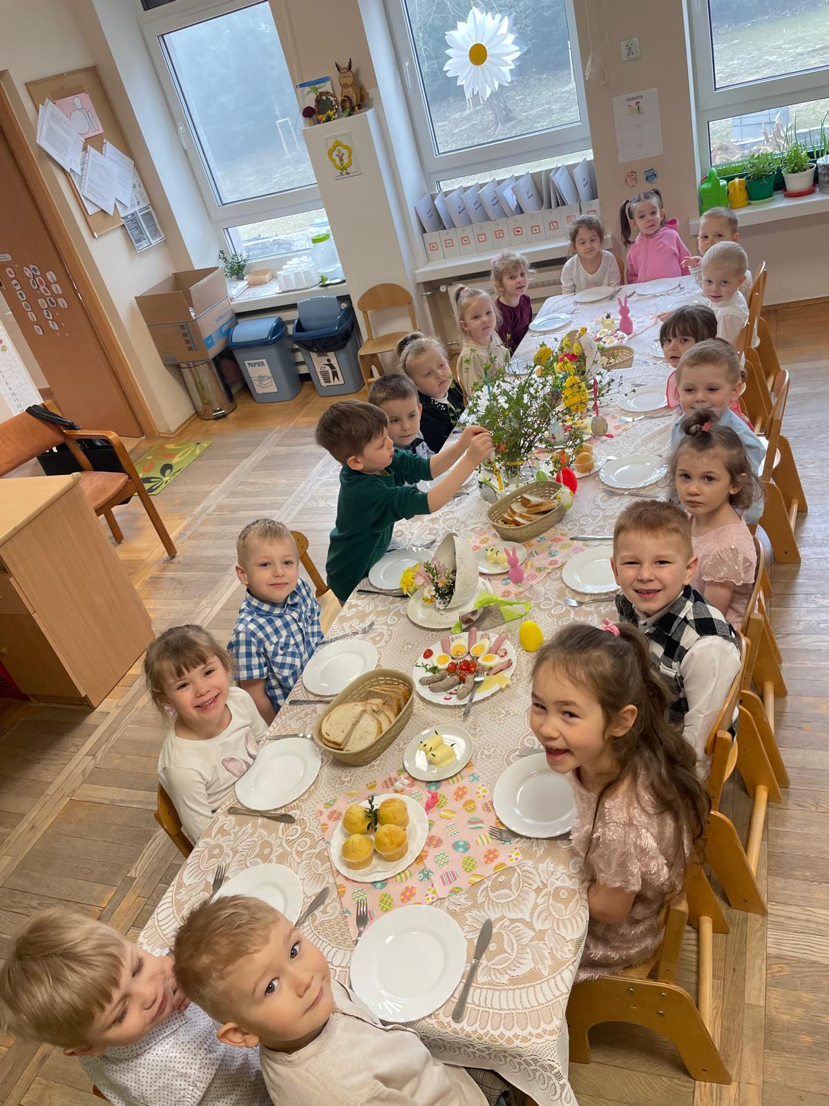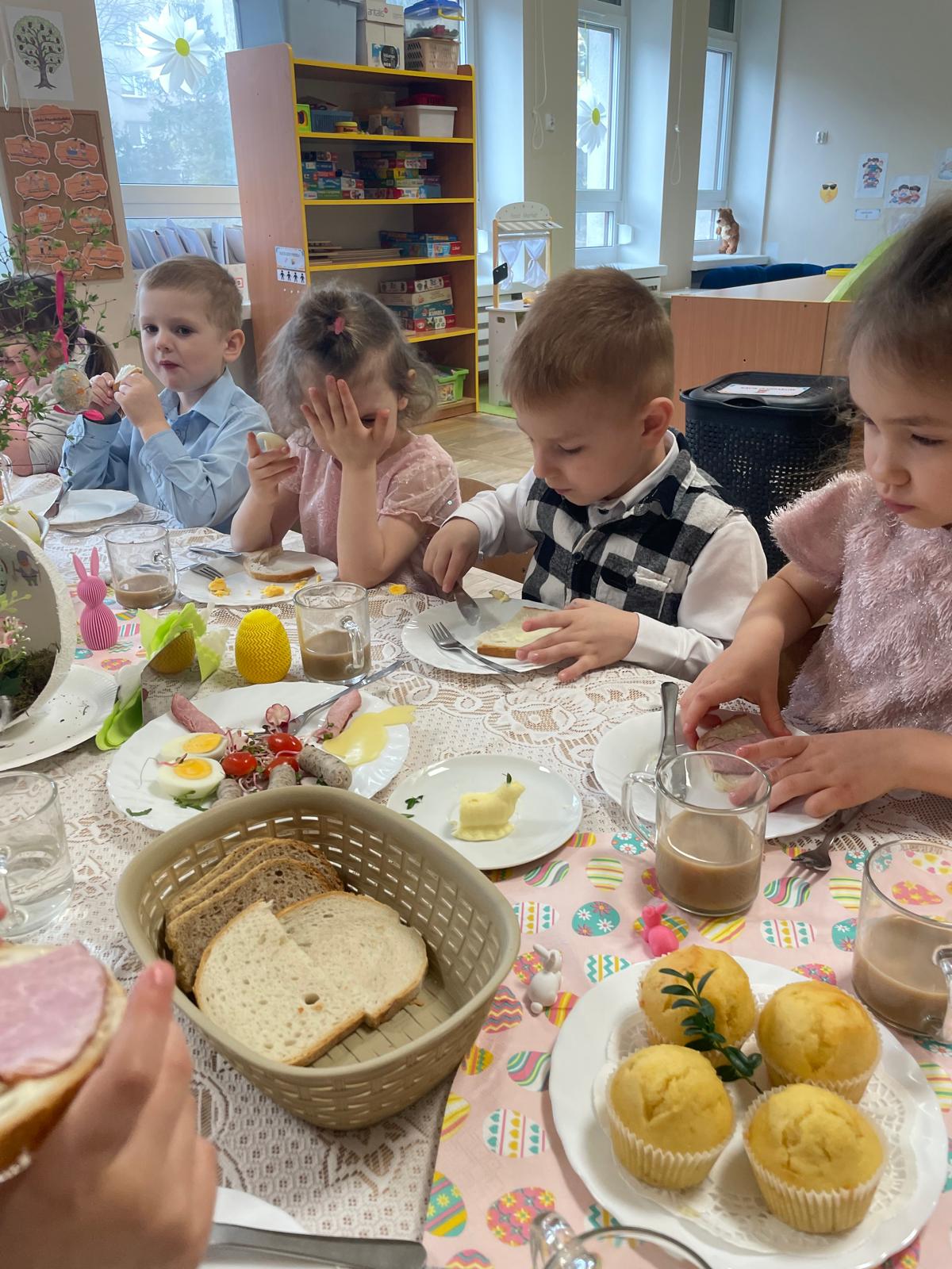 Dzieci wspólnie przygotowały wielkanocny stół, ucząc się nakrywania, porządku i zasad zachowania podczas posiłku. Następnie z apetytem spróbowały świątecznych potraw i dzieliły się swoimi wrażeniami.